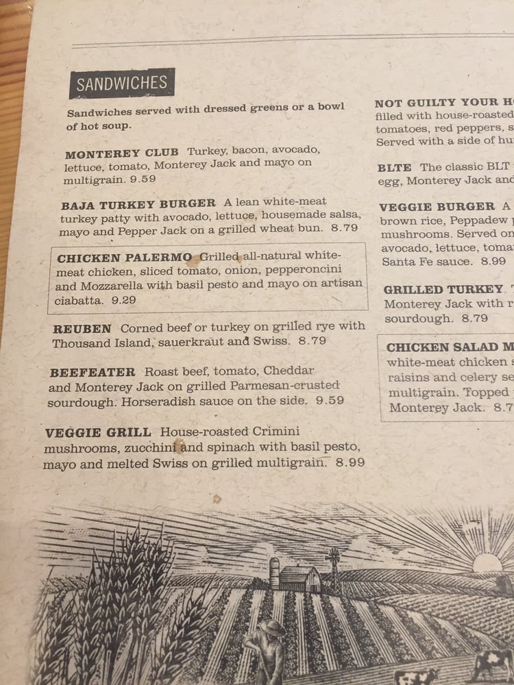 Turkey, bacon, avocado, organic mixed greens, tomato, Monterey Jack and mayo on sourdough.