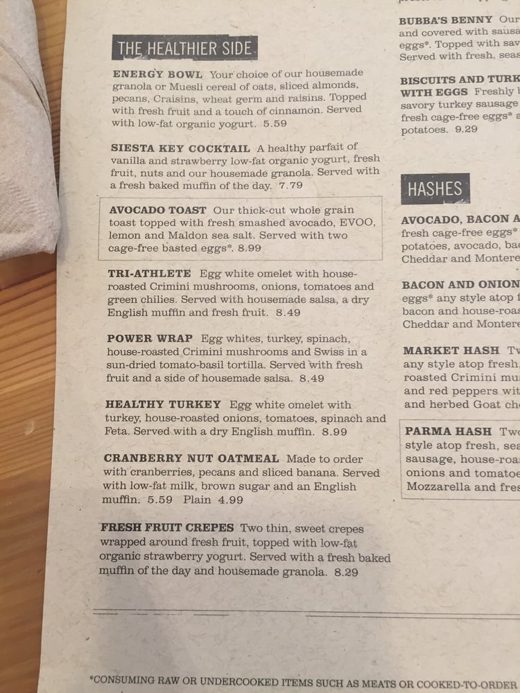 Our thick-cut whole grain toast topped with fresh smashed avocado, extra virgin olive oil, lemon and maldon sea salt. Served with 2 cage-free basted eggs.