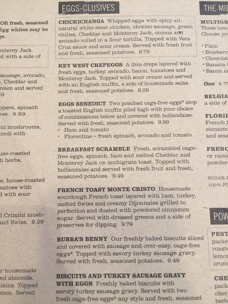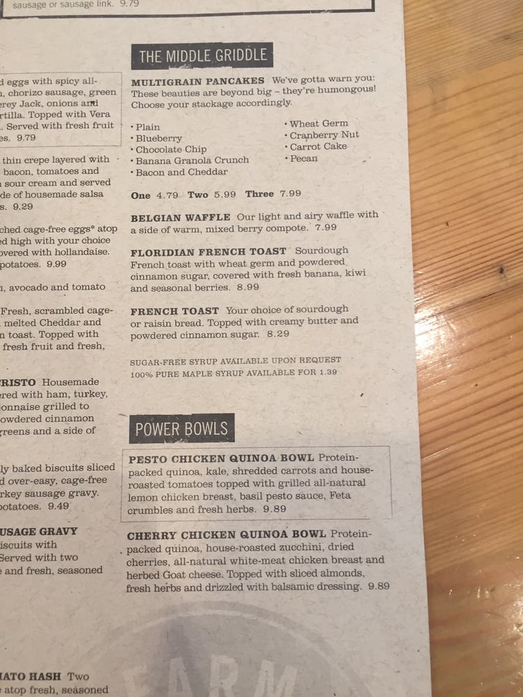 2 fresh cage-free eggs any style with either a light and a multigrain pancake. Plus your choice of bacon, turkey sausage or pork sausage link.
