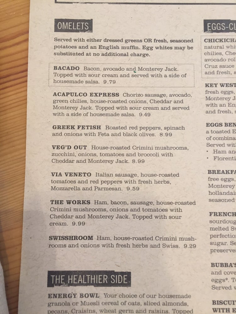 Ham, bacon, sausage, house-roasted crimini mushrooms, onions and tomatoes with cheddar and Monterey Jack. Topped with all-natural sour cream.
